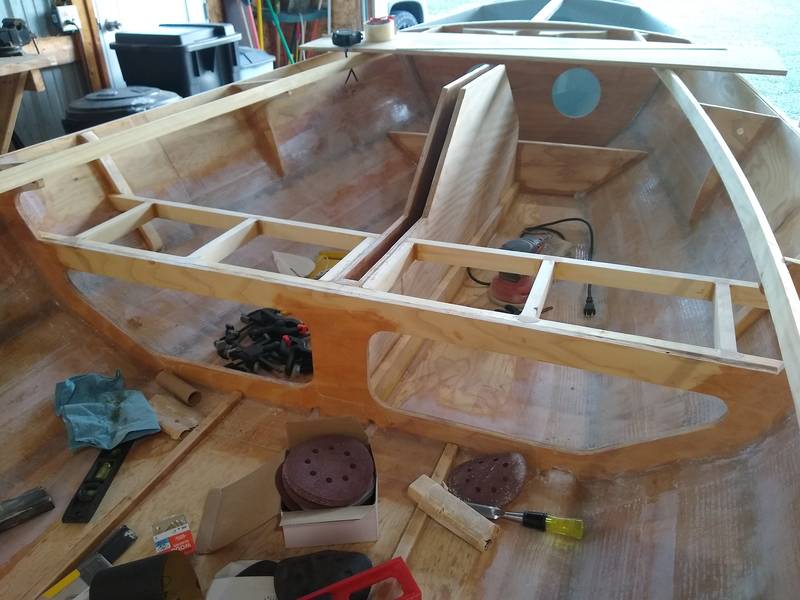 The mast partner and mast step have been cut out for awhile, so it's time to finally get them into the boat. Everything is measured and marked. I have to be precise or the mast won't stand at the correct angle and the boat won't sail right. Just dry-fitting in this picture, but they'll get glued and screwed to be extra secure.