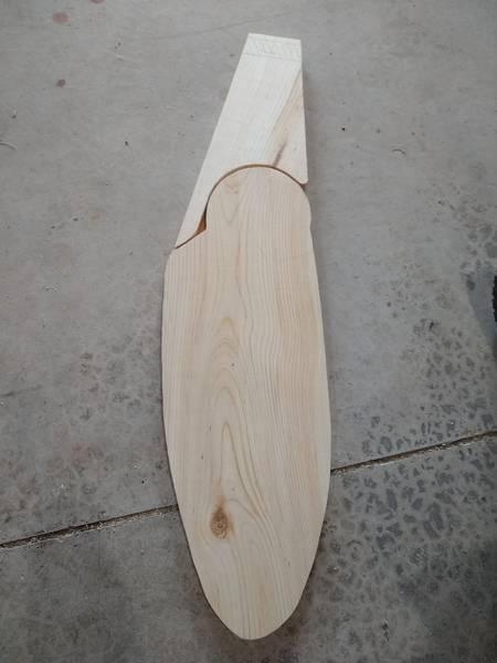 First, I laminated the centerboard from two pieces of 12mm plywood (1/2 inch). The lines are drawn where I need to shape it into an airfoil so it cuts through the water to help the boat track upwind.