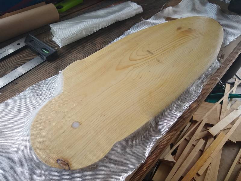 Glassing the rudder to add strength and durability. Notice the circle of hardened epoxy - this is where the bolt goes. I drilled a large hole and filled it with epoxy. When the fiberglass is finished, I'll re-drill the correct (smaller) size hole which will leave some of the thickened epoxy to act as a bushing for the bolt.
