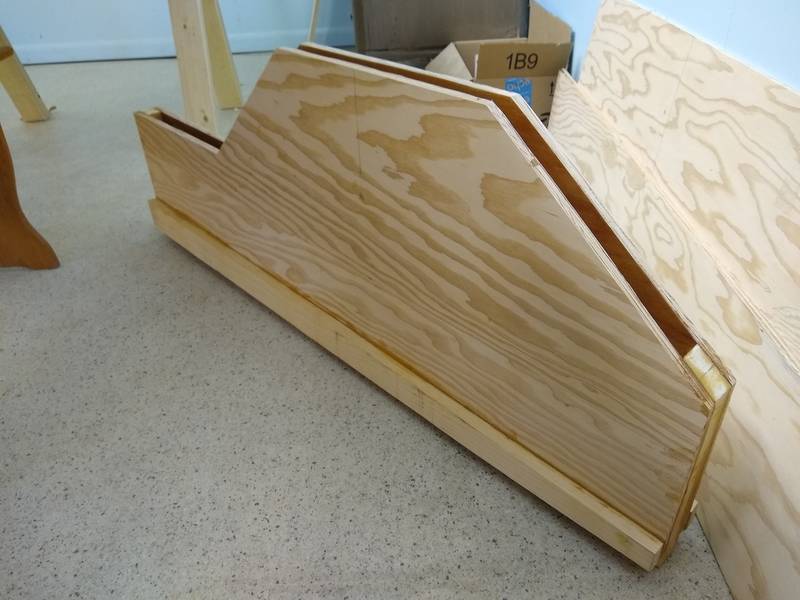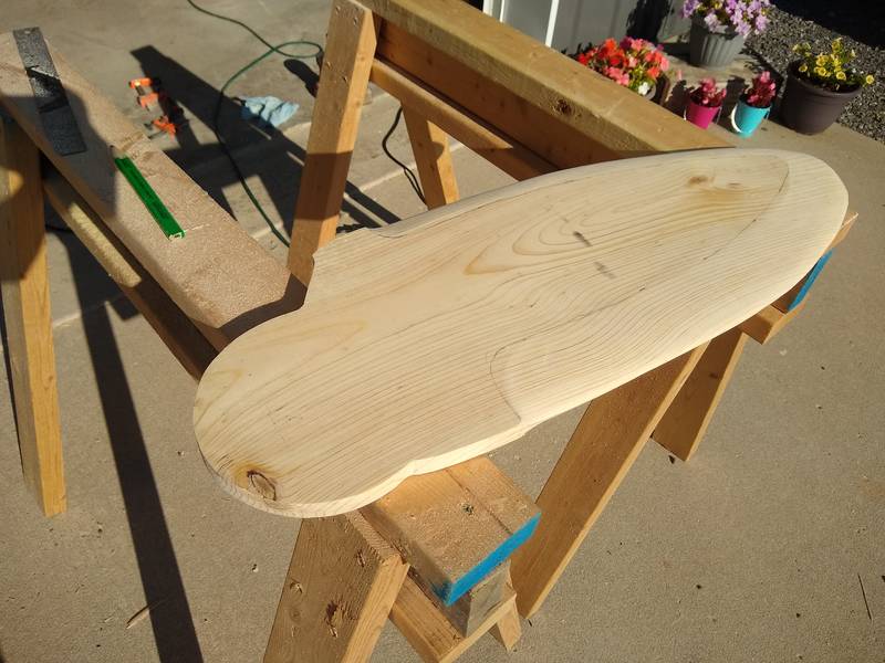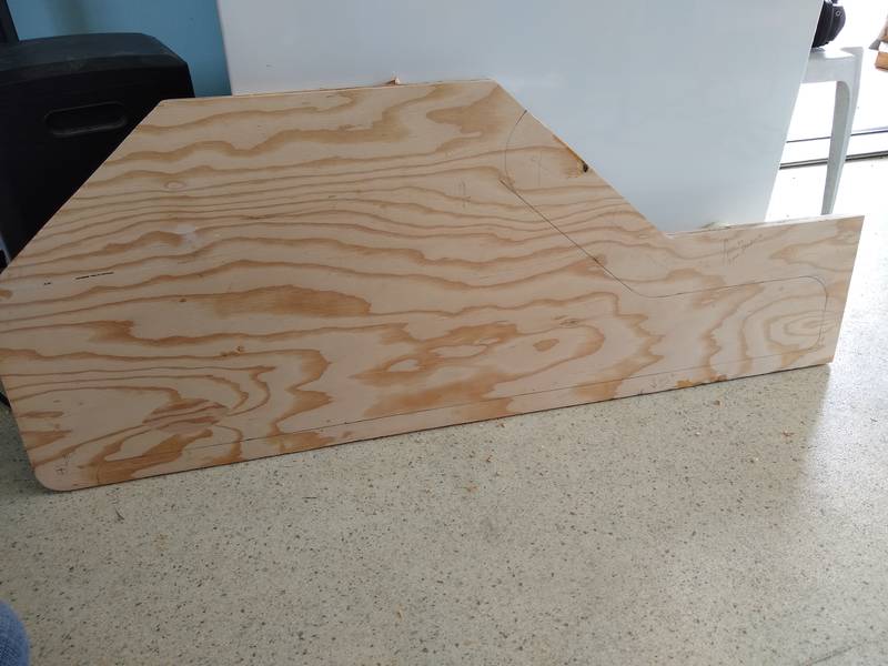 First, I laminated the centerboard from two pieces of 12mm plywood (1/2 inch). The lines are drawn where I need to shape it into an airfoil so it cuts through the water to help the boat track upwind.