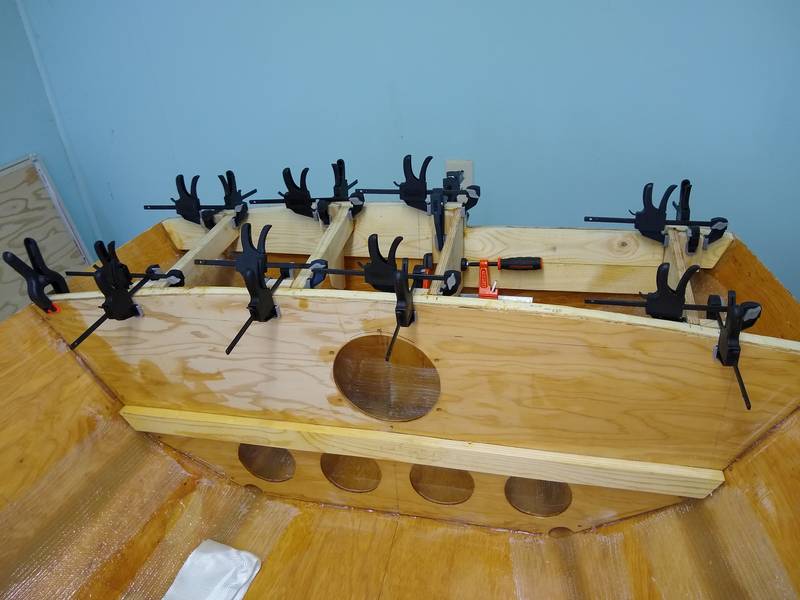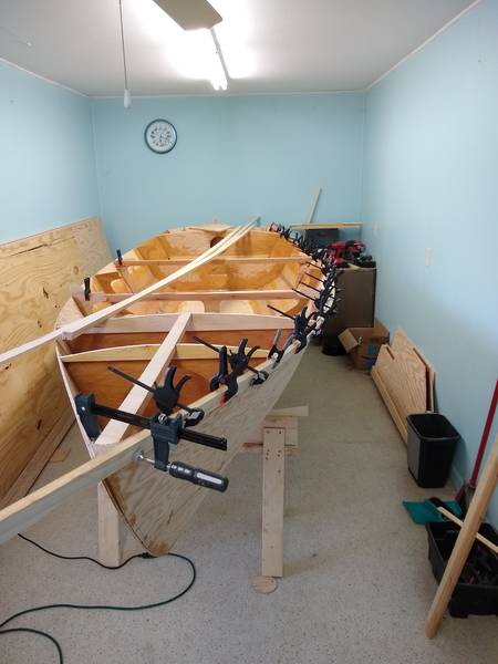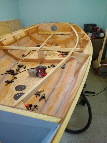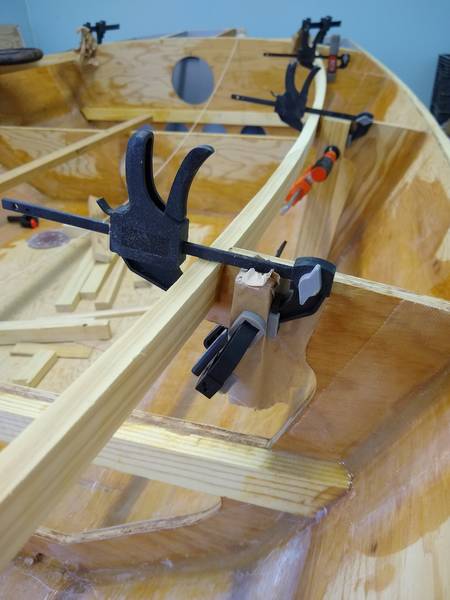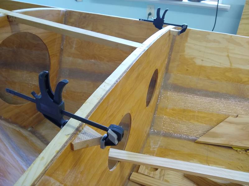 Side deck carling blocks (the triangles) will work with the knees to hold the carlings in place. Carlings are basically long boards that curves around the inside to give support to the side decks. The unglued carlings are laying in the boat in the "king plank" picture.