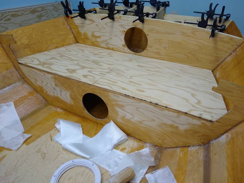 One hole cut out, one to go. And the lines show where the centerboard case will sit.