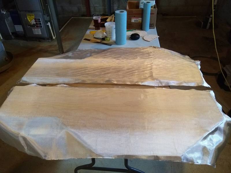 Here I started by roughly cutting the cloth to size. Then I used a bondo spreader to smooth out all the wrinkles before spreading on the epoxy.