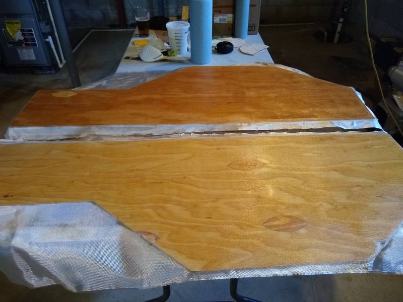 Unfortunately, there is one mistake. You can see in the lower right corner of the picture that there is a chip out of the plywood which prevents the glass from laying flat. I was going to fill it with thickened epoxy, but completely forgot until it was too late. We'll just have to see how the glass sets up over it. I may have to sand it out and fill it in later.