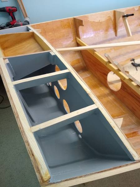 I primered under the aft seat and installed the seat braces. The plans call for three braces, but I went with four since I'm only using 1/4 inch plywood for the seat and I don't want any bowing under my butt. Besides, I can envision this being used as a step to get into the boat, so it needs to take my full weight.