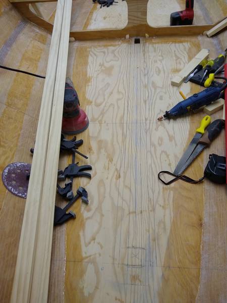 Yes, that's a hole in the bottom of my boat. Like a first-time surgeon hesitant to make an incision, it took my ten minutes to get up the nerve to cut into the floor. The centerboard case end post will fit into the hole for positioning, and the rest of the centerboard slot will be cut out once the case is glued in and the boat is flipped over.