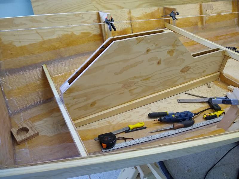 The mast partner and mast step have been cut out for awhile, so it's time to finally get them into the boat. Everything is measured and marked. I have to be precise or the mast won't stand at the correct angle and the boat won't sail right. Just dry-fitting in this picture, but they'll get glued and screwed to be extra secure.